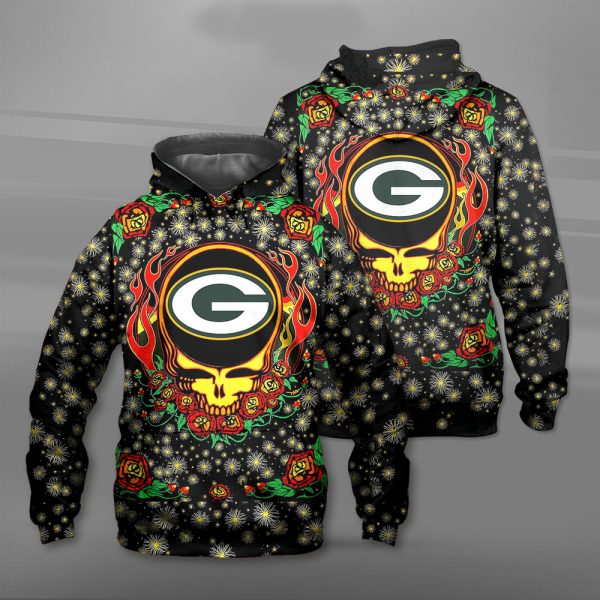 Men / Women Green Bay Packers 3D Skull Flower Hoodie, NFL Green Bay Packers Apparel