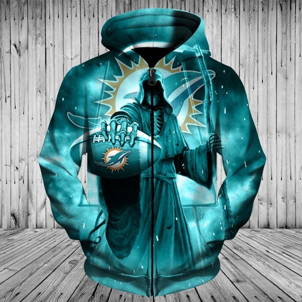 Men / Women Miami Dolphins 3D Death Skull Zipper Hoodie, Miami Dolphins Zipper Hoodie, NFL Miami Dolphins Apparel