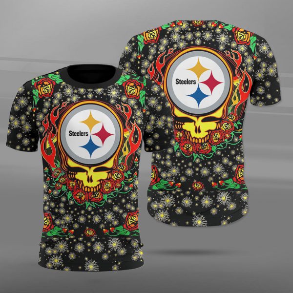 Men / Women Pittsburgh Steelers 3D Skull Flower T-shirt, NFL Pittsburgh Steelers Apparel